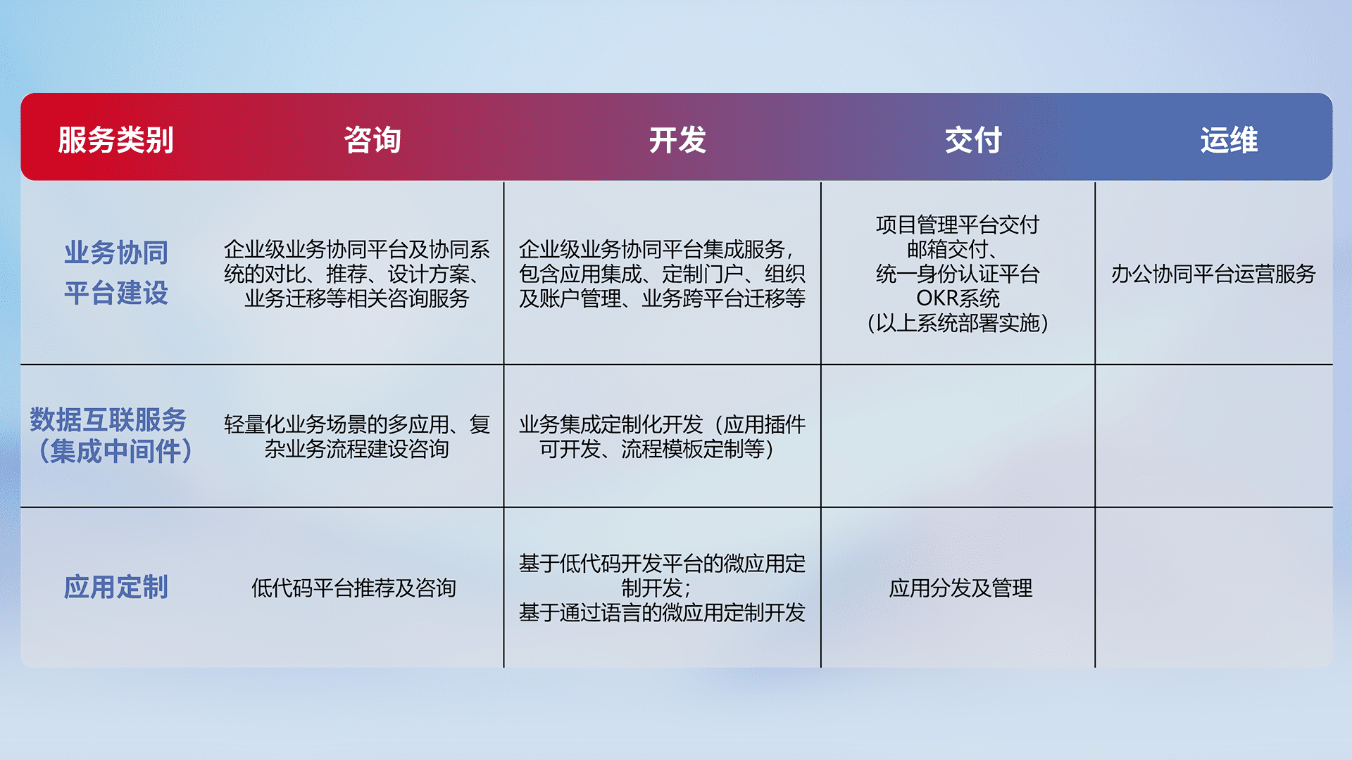 针对钉钉、、、企微、、、、IDaas等平台级产品提供产品的规划、、方案、、交付、、定制化开发等服务,,,,实现如统一协同办公、、、智能客户服务、、、混合会议管理、、、智能数据查询、、等业务场景,,实现数字化转型。。。